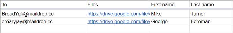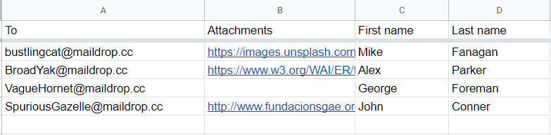 If you want to send actual attachments with your email (and not links) then those files need to be publicly accessible. In this case. simply create a new column in your sheet with the name “attachments” and paste the publicly accessible link to the file in this column as shown below: