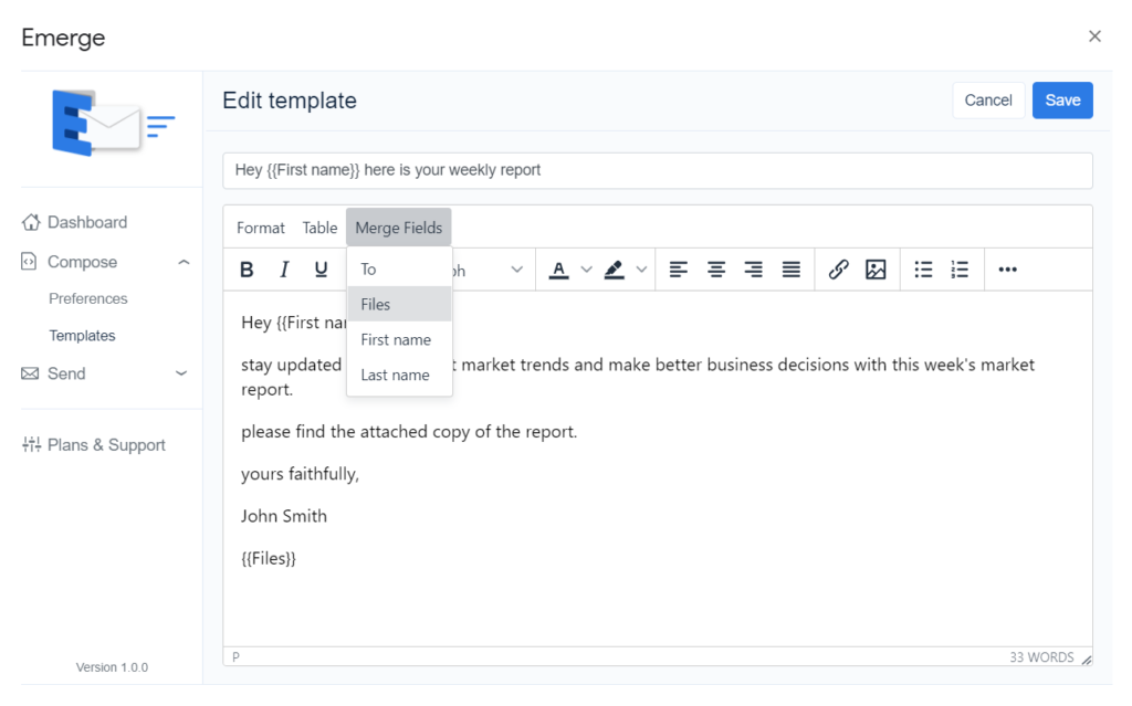 Once you have these file links in data, you can add it as merge fields either manually or using the Merge fields menu while personalizing your email.